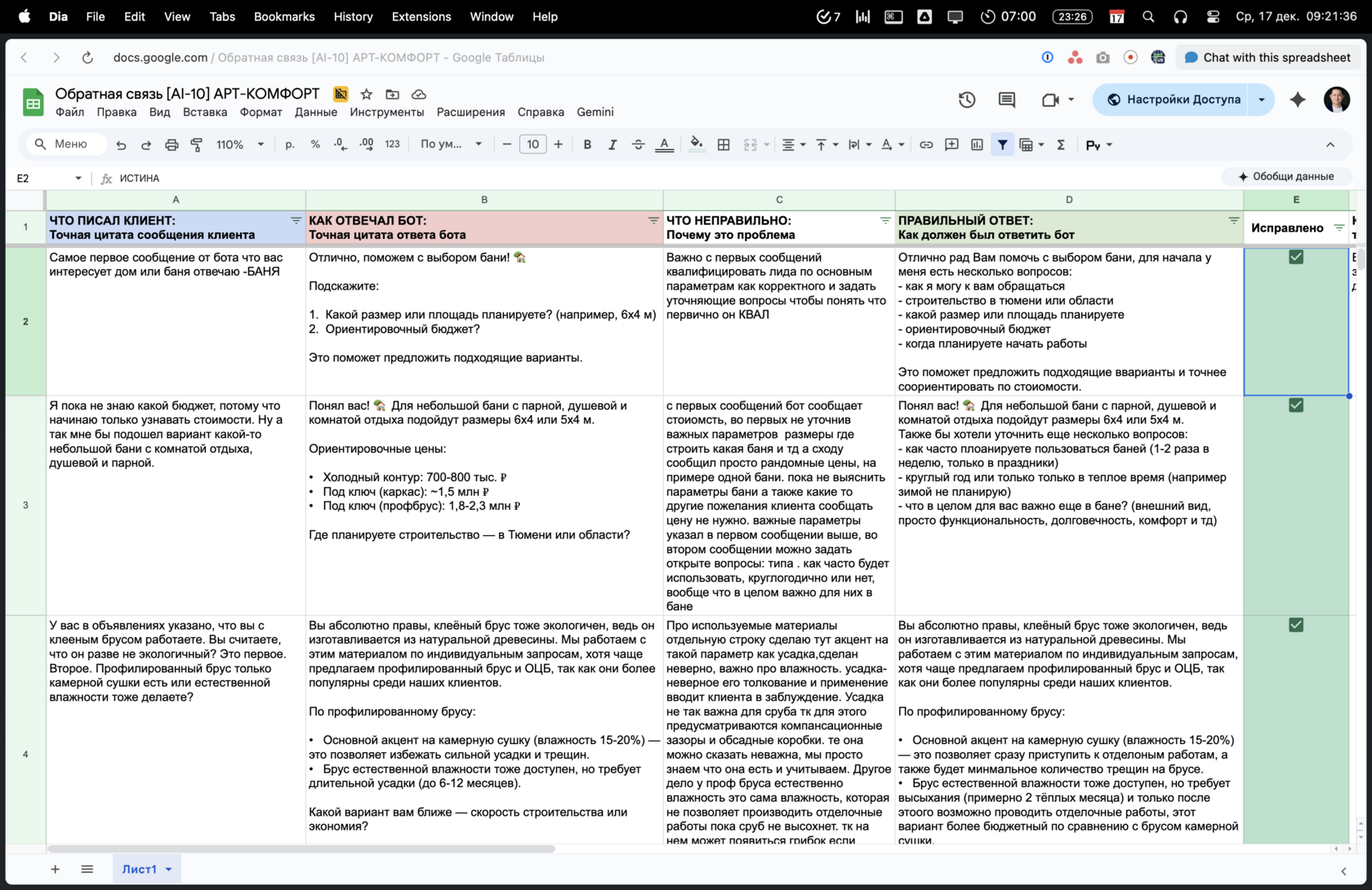 Рабочая таблица доработок: ошибки, причины и корректировки логики агента