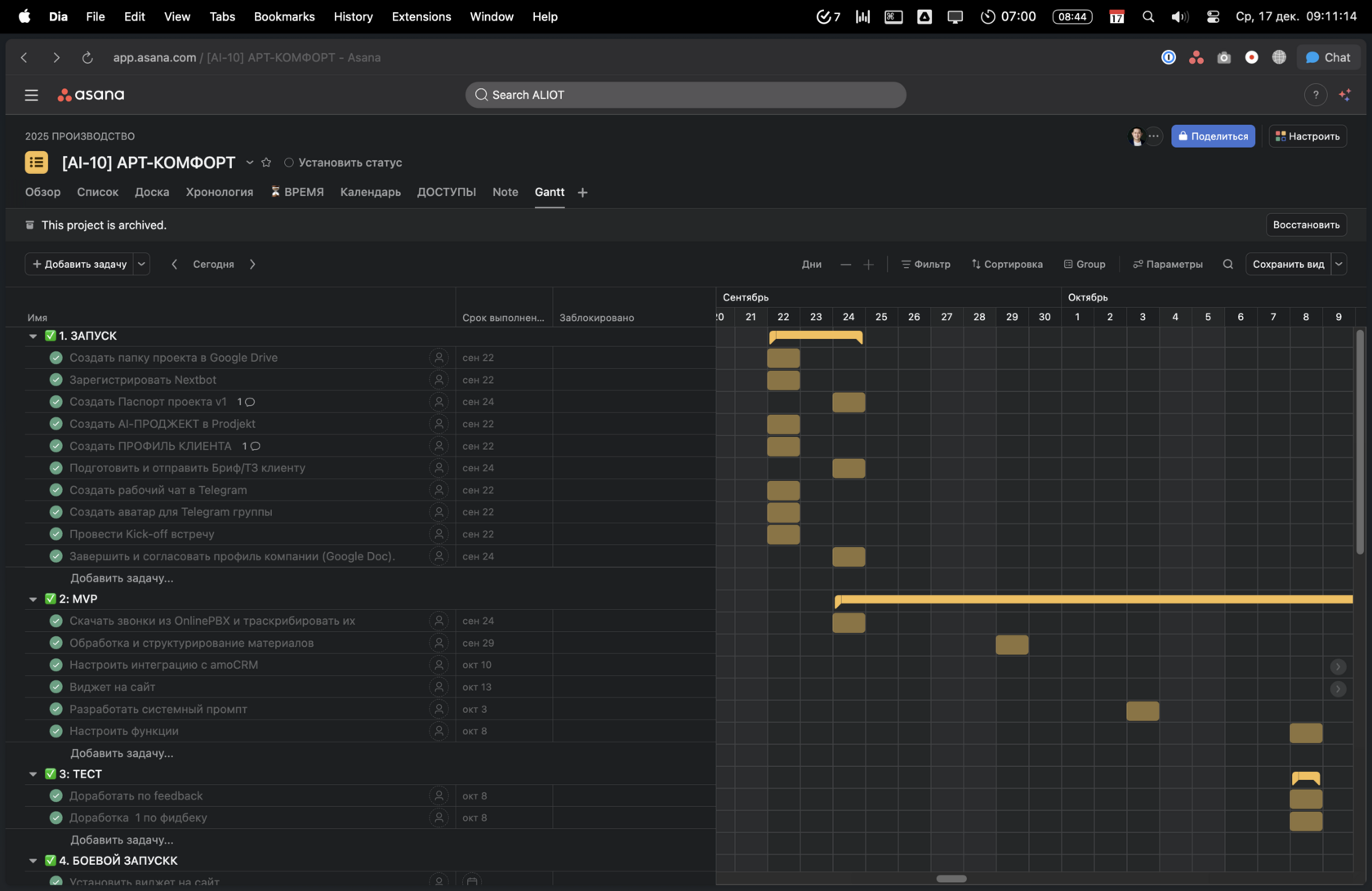 Проект ведётся в таск-менеджере: этапы, сроки, статус задач и ответственность сторон