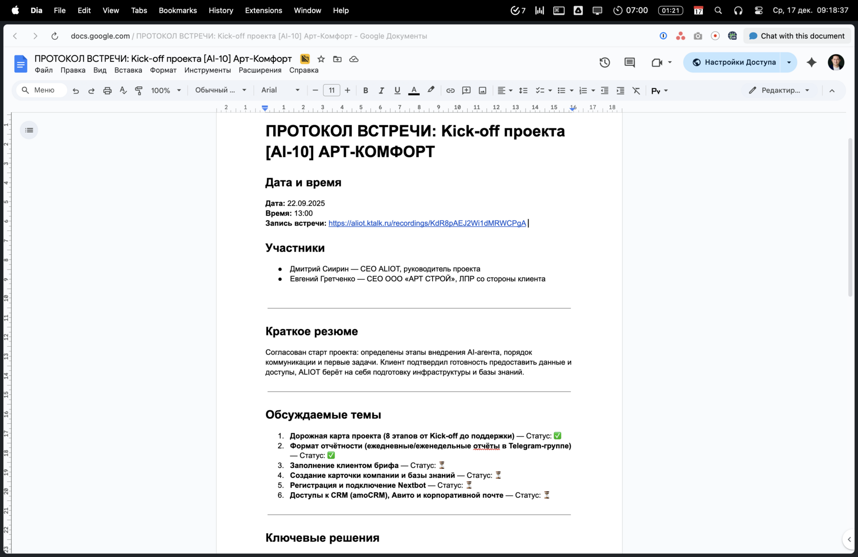 Фрагмент протокола kick-off встречи — все договорённости и этапы фиксируются письменно
